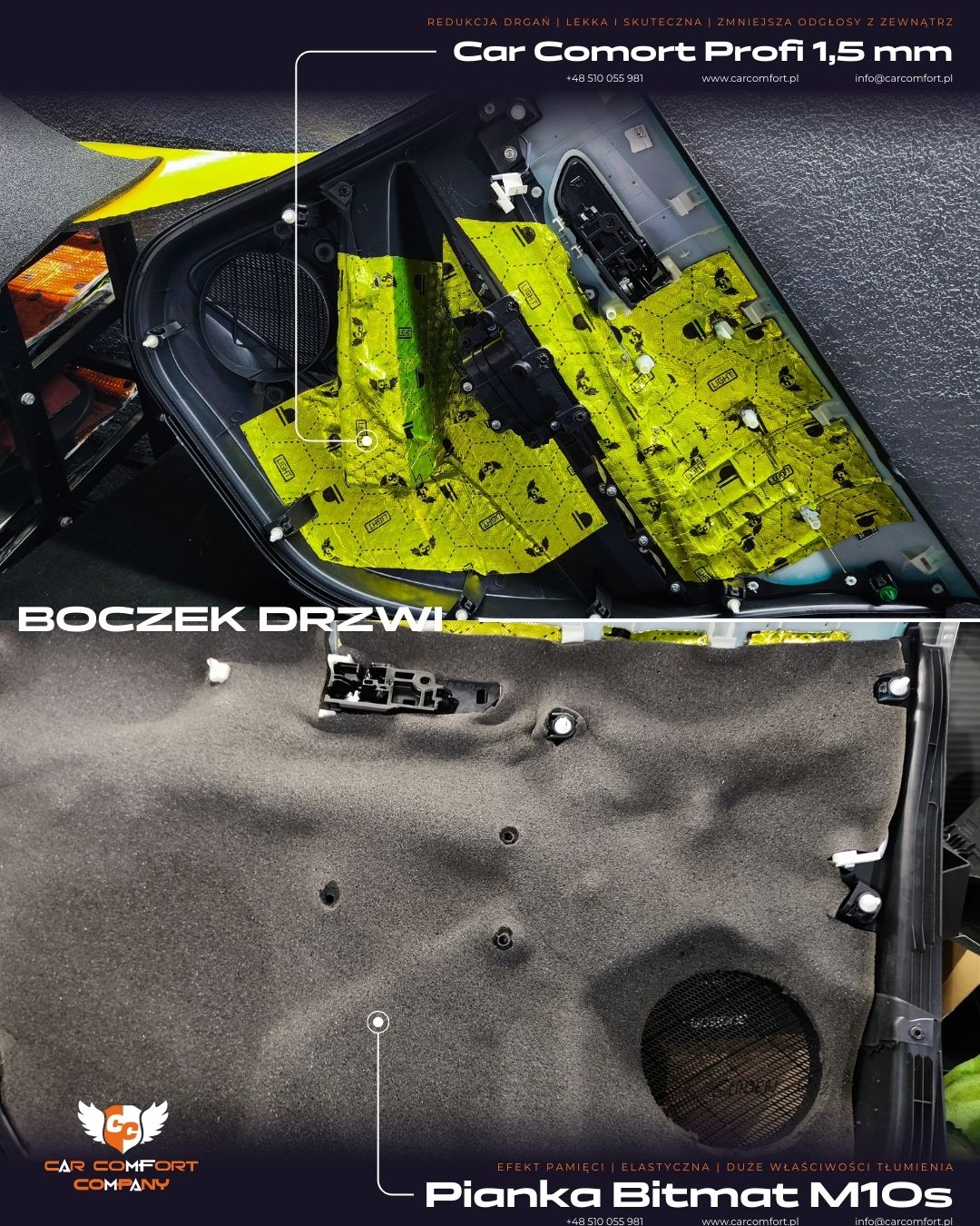 Boczki drzwi otrzymały matę Car Comfort Profi oraz piankę Bitmat M10s, która usuwa trzaski plastików i poprawia szczelność akustyczną wnętrza.