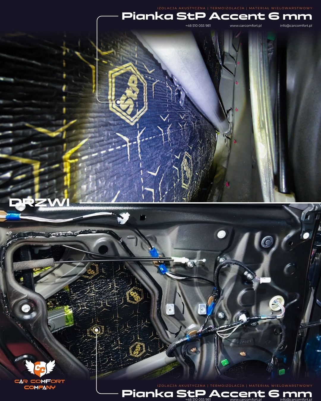 Drzwi zostały wyciszone trójwarstwowo przy użyciu maty butylowej Car Comfort Profi 1,5 mm, która usztywnia poszycie i redukuje drgania blachy. Drugą warstwę stanowi StP Accent 6 mm, odpowiadający za pochłanianie fal dźwiękowych i eliminację rezonansów. Trzecia warstwa to ponownie Car Comfort Profi, co dodatkowo uszczelnia konstrukcję drzwi.