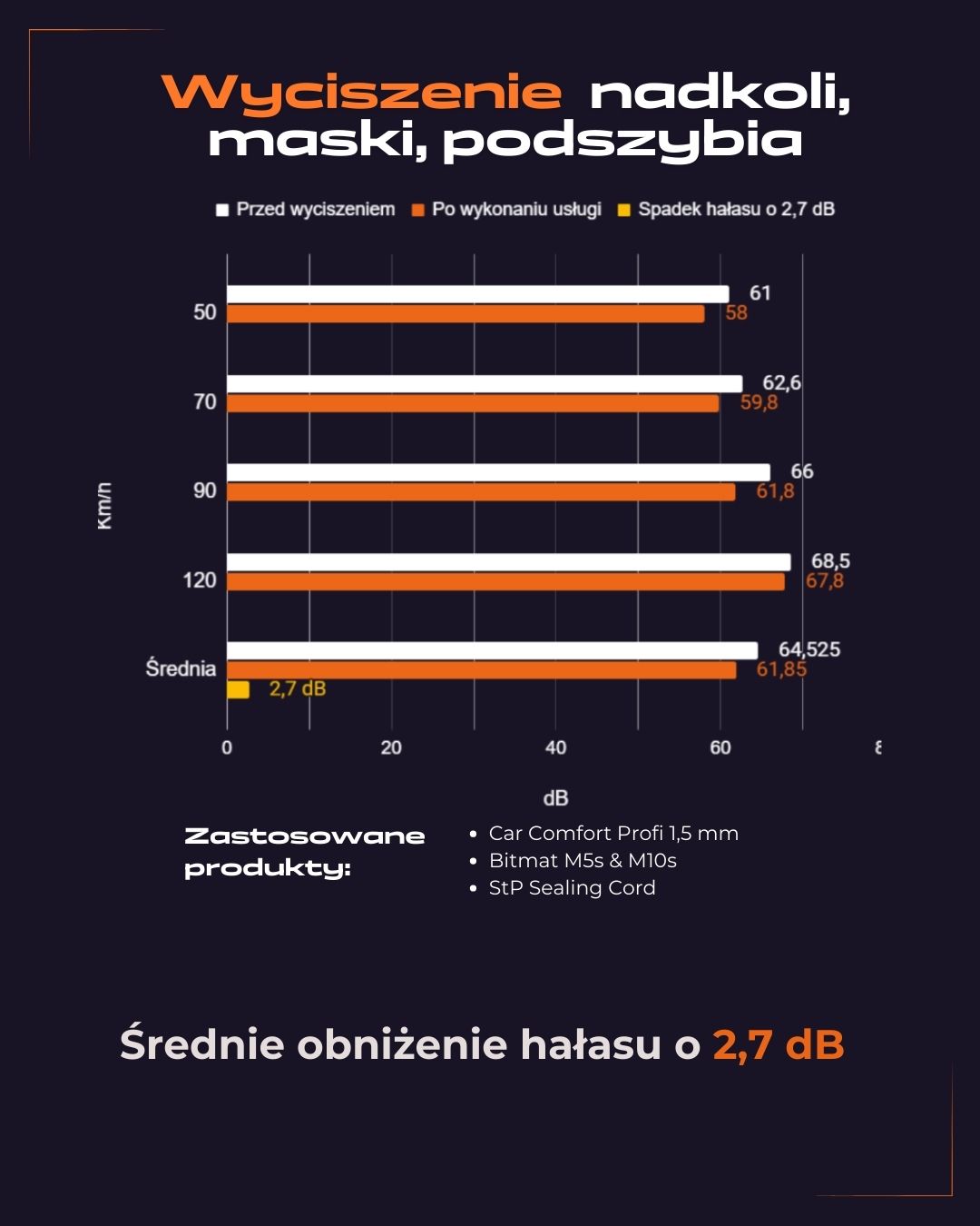 Elementy metalowe zostały dodatkowo zabezpieczone powłoką StP Noise Liquidator, która skutecznie tłumi drgania blachy oraz ogranicza hałas przenoszony z nawierzchni.