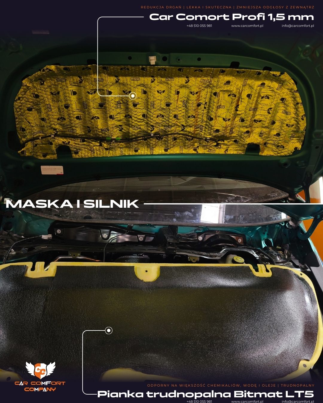 Maska została wyciszona przy użyciu pianki pochłaniającej Bitmat LT5, która jest odporna na temperaturę i skutecznie redukuje hałas jednostki napędowej przenikający do kabiny.