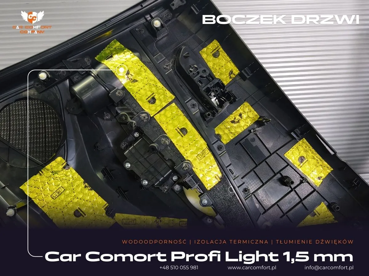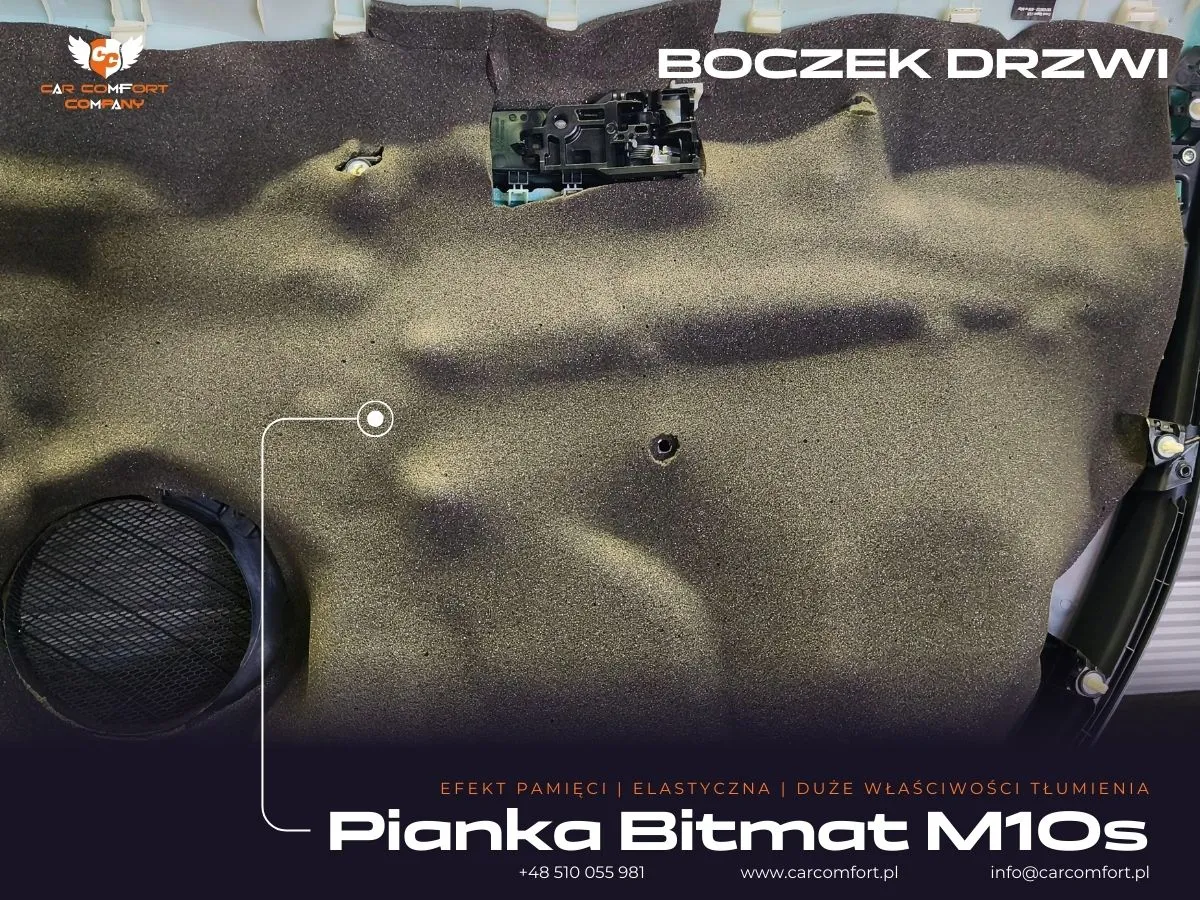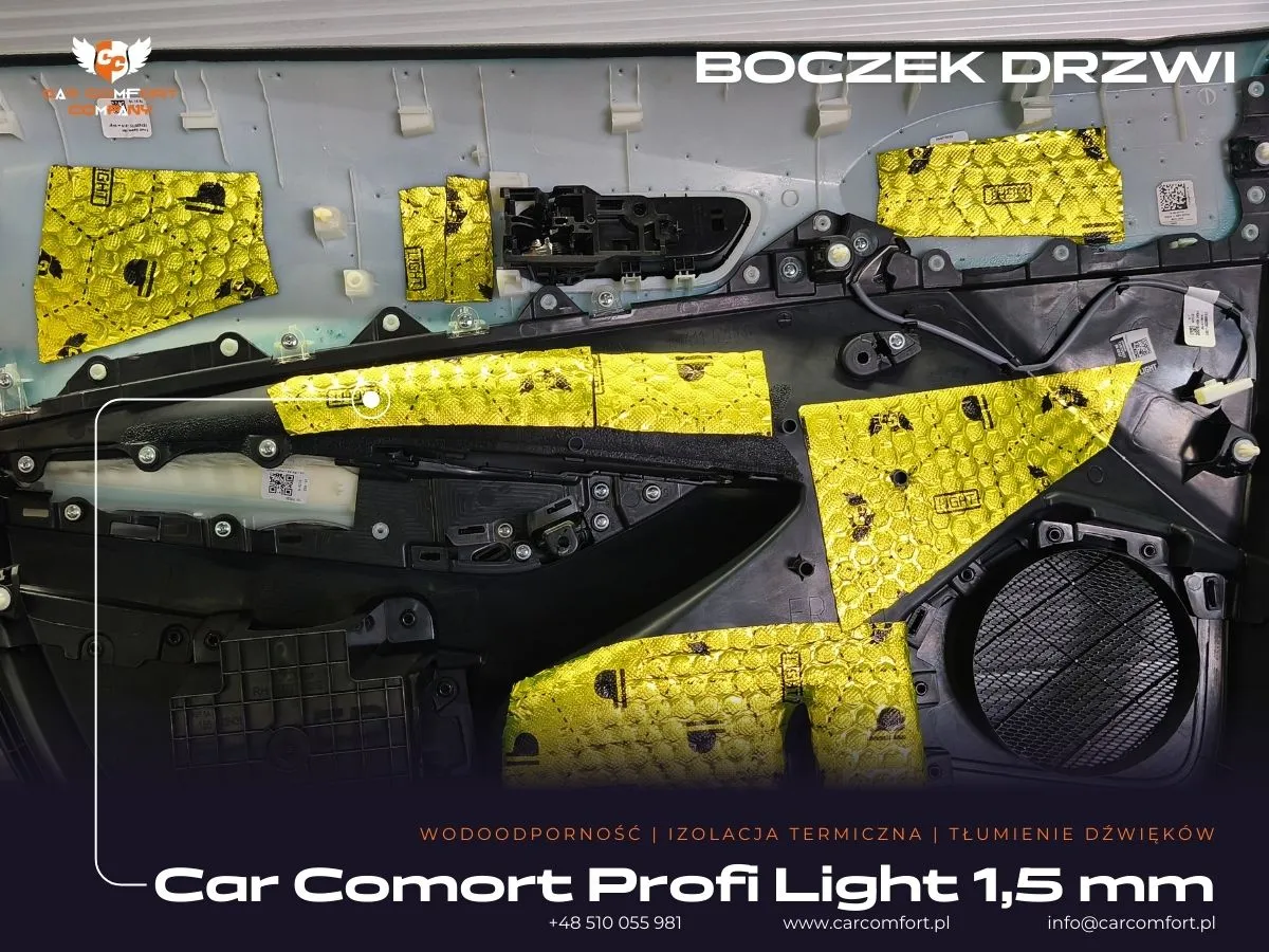 W ramach prac w Toyocie Corolli skupiliśmy się na maksymalnym wyeliminowaniu hałasów dochodzących z zewnątrz. Drzwi zostały wygłuszone z wykorzystaniem maty butylowej Car Comfort Profi 1,5 mm. Ta wysokiej jakości mata została zaaplikowana zarówno na wewnętrzną, jak i zewnętrzną blachę drzwi, skutecznie tłumiąc wibracje i rezonanse. Na boczkach drzwi po raz kolejny wykorzystano matę Car Comfort Profi 1,5 mm, a jako warstwę uzupełniającą zastosowano piankę Bitmat M10s, która doskonale pochłania fale dźwiękowe i zapewnia dodatkową izolację akustyczną.