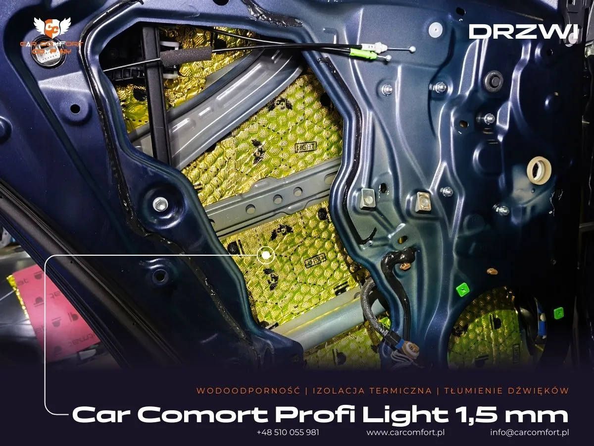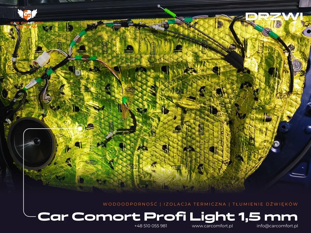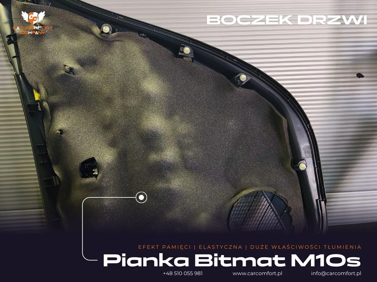 W ramach prac w Toyocie Corolli skupiliśmy się na maksymalnym wyeliminowaniu hałasów dochodzących z zewnątrz. Drzwi zostały wygłuszone z wykorzystaniem maty butylowej Car Comfort Profi 1,5 mm. Ta wysokiej jakości mata została zaaplikowana zarówno na wewnętrzną, jak i zewnętrzną blachę drzwi, skutecznie tłumiąc wibracje i rezonanse. Na boczkach drzwi po raz kolejny wykorzystano matę Car Comfort Profi 1,5 mm, a jako warstwę uzupełniającą zastosowano piankę Bitmat M10s, która doskonale pochłania fale dźwiękowe i zapewnia dodatkową izolację akustyczną.