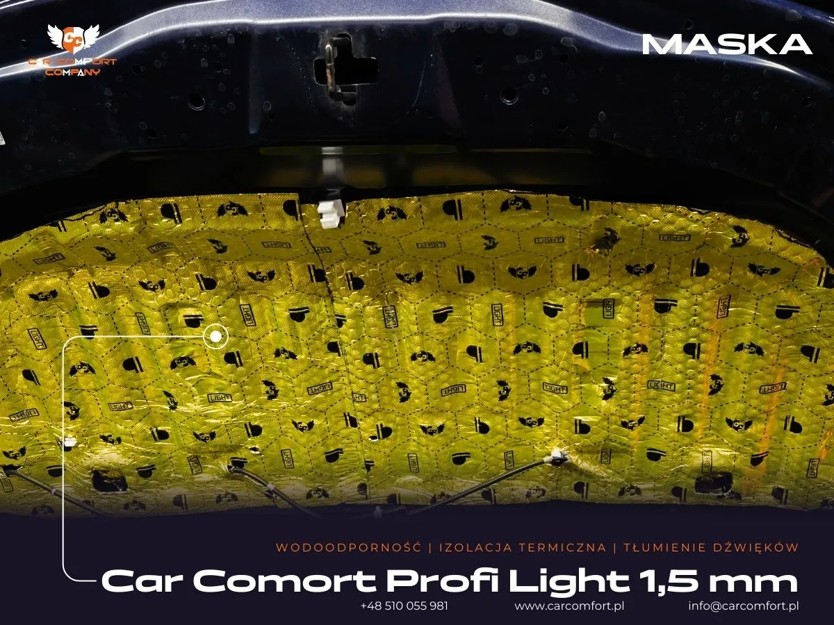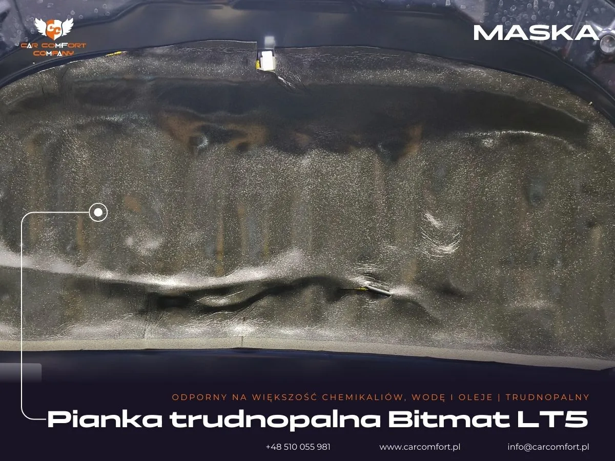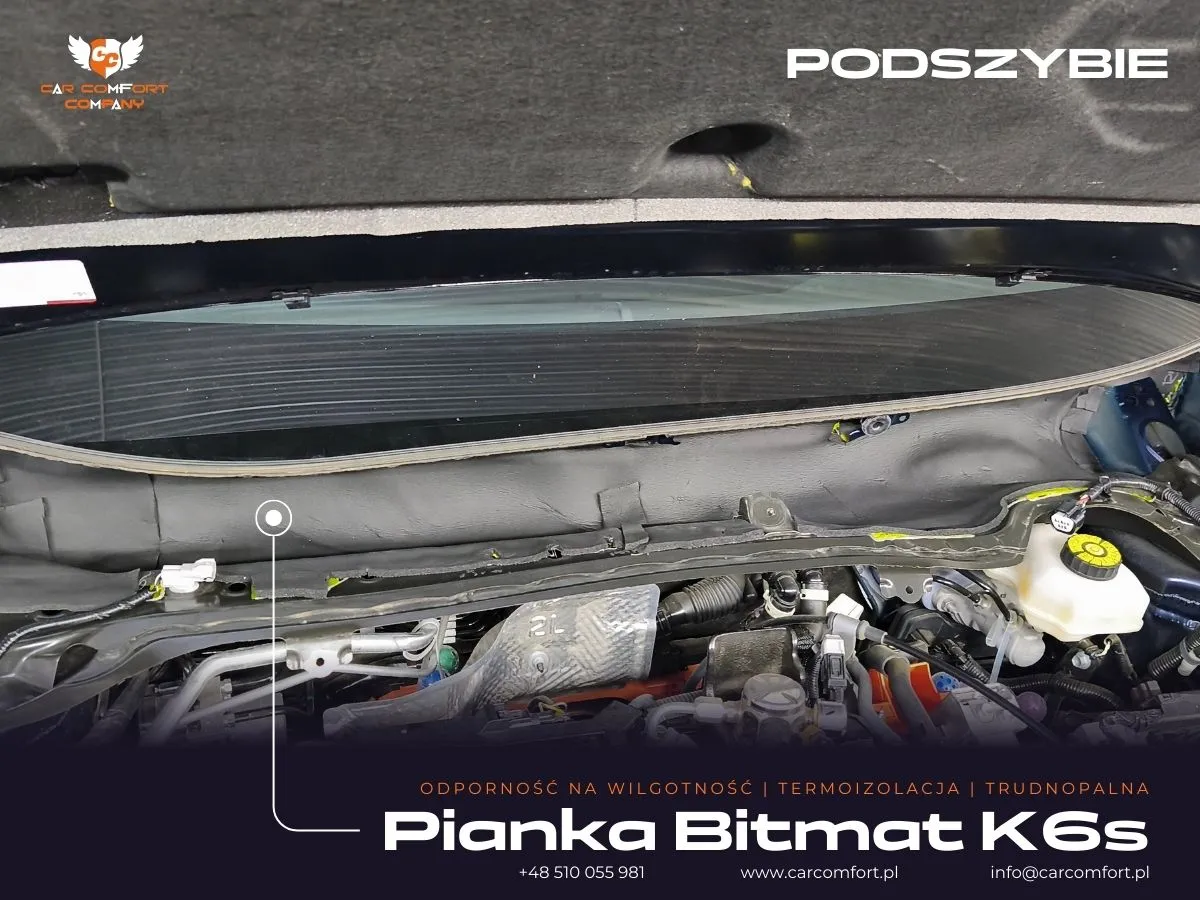 Ponadto, w celu redukcji hałasu z komory silnika, wyciszyliśmy kluczowe elementy. Na maskę nałożono matę Car Comfort Profi 1,5 mm, a następnie piankę Bitmat LT5, co znacząco zmniejszyło przenikanie hałasu do kabiny. Na podszybiu zastosowano matę Car Comfort Profi 1,5 mm oraz piankę Bitmat K6s, co efektywnie obniżyło poziom hałasu z drogi i silnika. Dodatkowo, w komorze silnika zastosowano StP HS, materiał o właściwościach termoakustycznych, który skutecznie izoluje od ciepła i hałasu silnika.