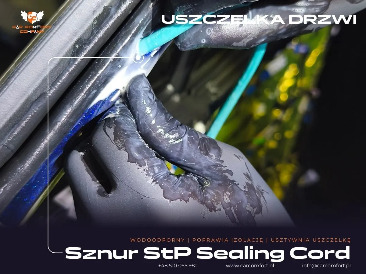 Aby zapobiec przenikaniu szumu wiatru i innych niepożądanych dźwięków, przeprowadzono także wyciszenie uszczelek w całym pojeździe. Do tego celu użyliśmy specjalistycznego sznura StP Sealing Cord, który precyzyjnie wypełnia mikroszczeliny w profilach uszczelek, tworząc dodatkową barierę dźwiękową.