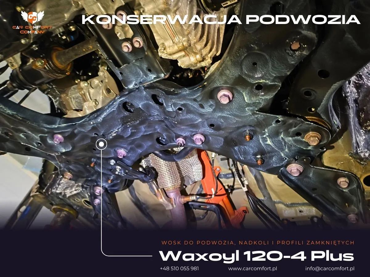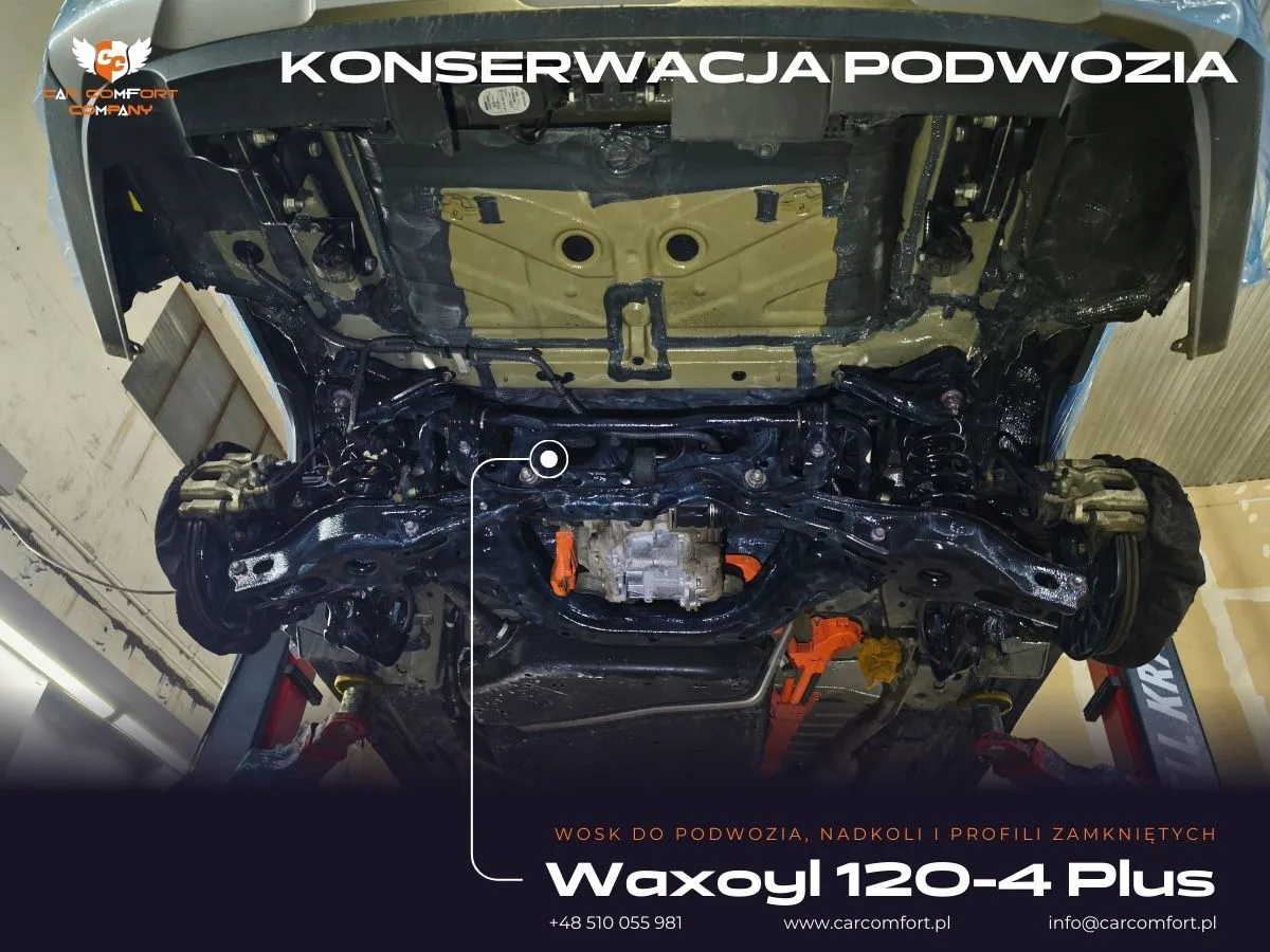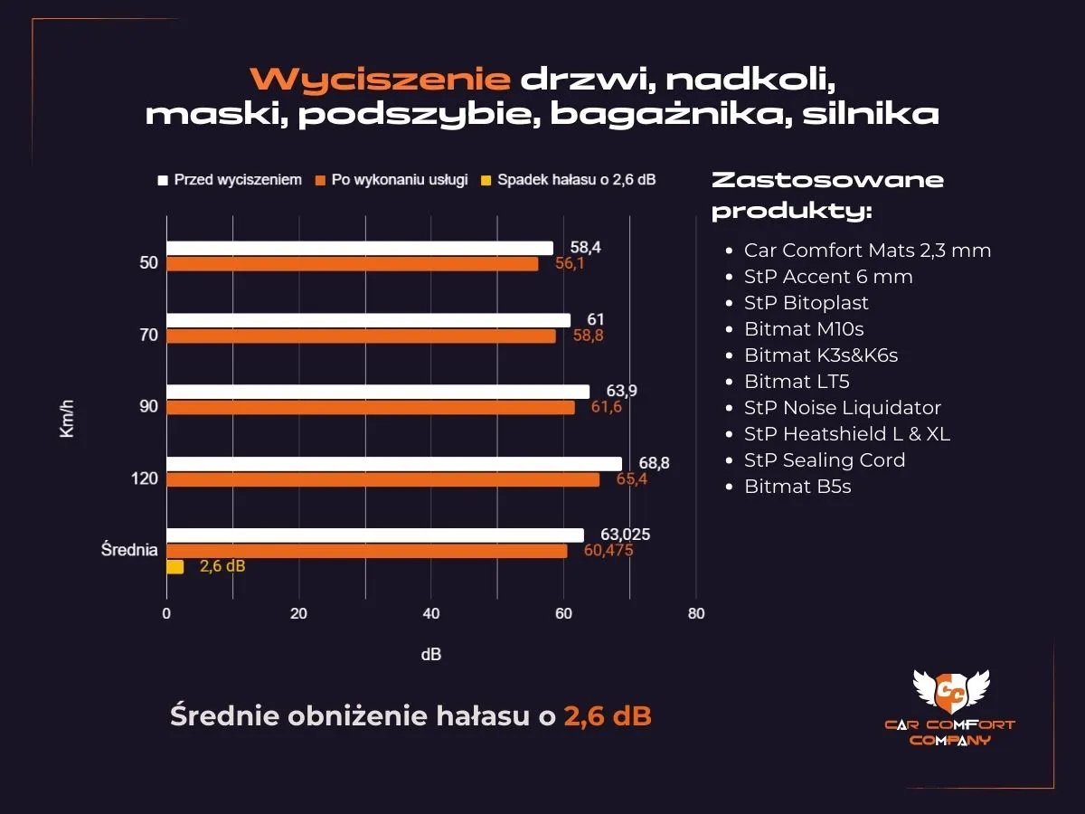 Podszybie zabezpieczono matą butylową oraz Bitmat K3s, ograniczając hałas dochodzący z komory silnika i przedniej osi.