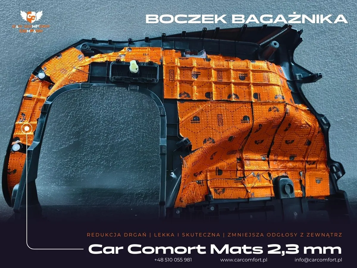 Bagażnik wyciszono analogicznie do podłogi, a jego boczki otrzymały matę butylową oraz Bitmat M10s, co znacząco poprawiło komfort akustyczny tylnej części wnętrza.