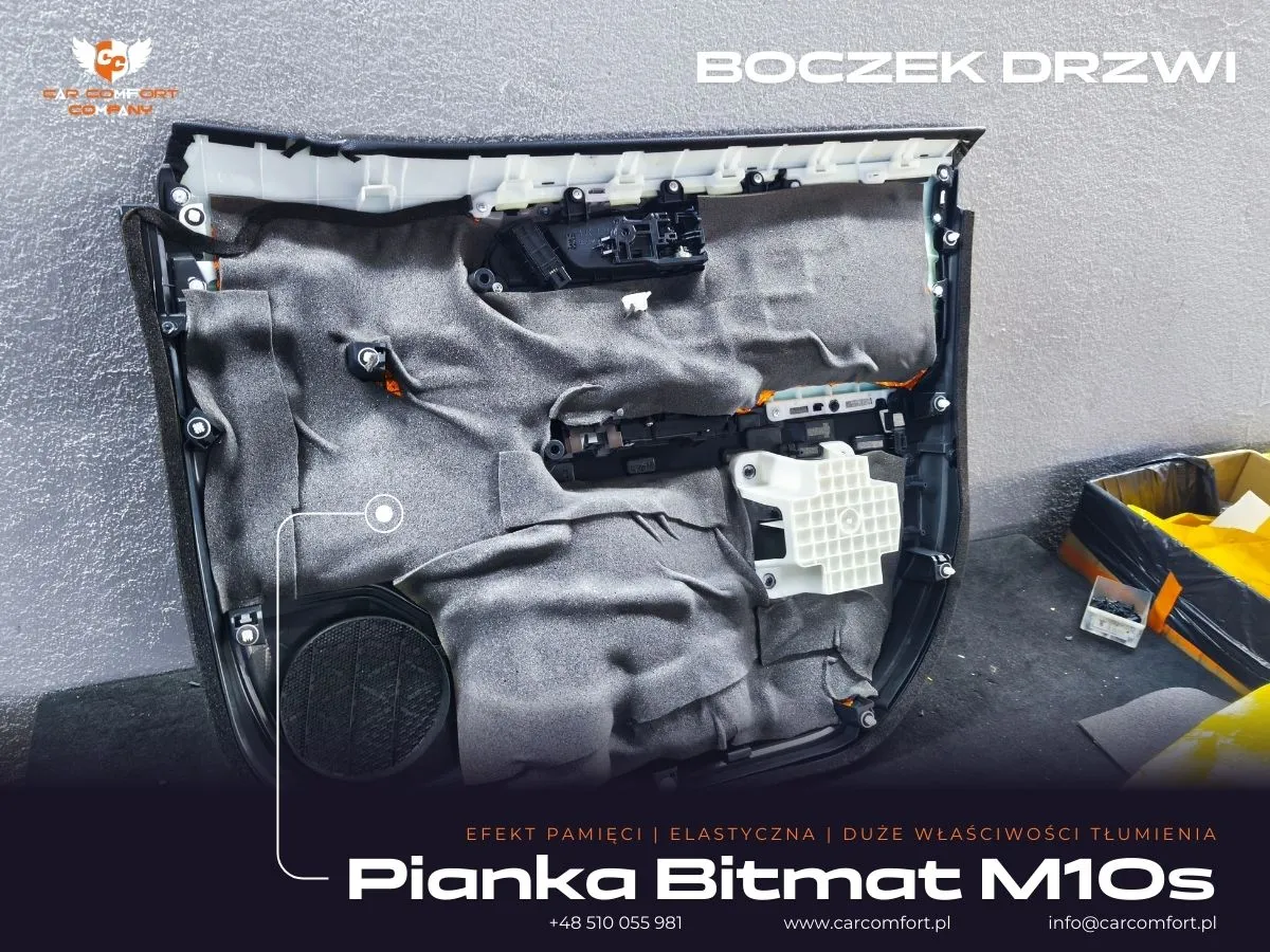 Boczki drzwi otrzymały Bitmat M10s, który usuwa trzaski plastików i poprawia szczelność akustyczną. Całość uzupełnia StP Sealing Cord, który uszczelnił drzwi i ograniczył szum powietrza.