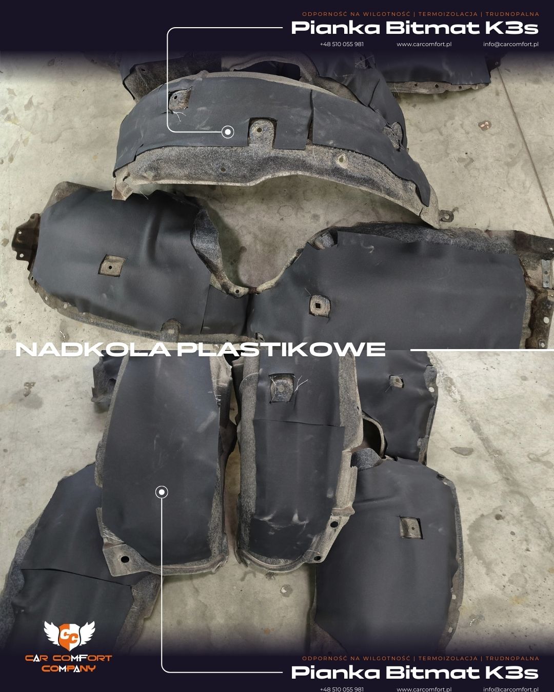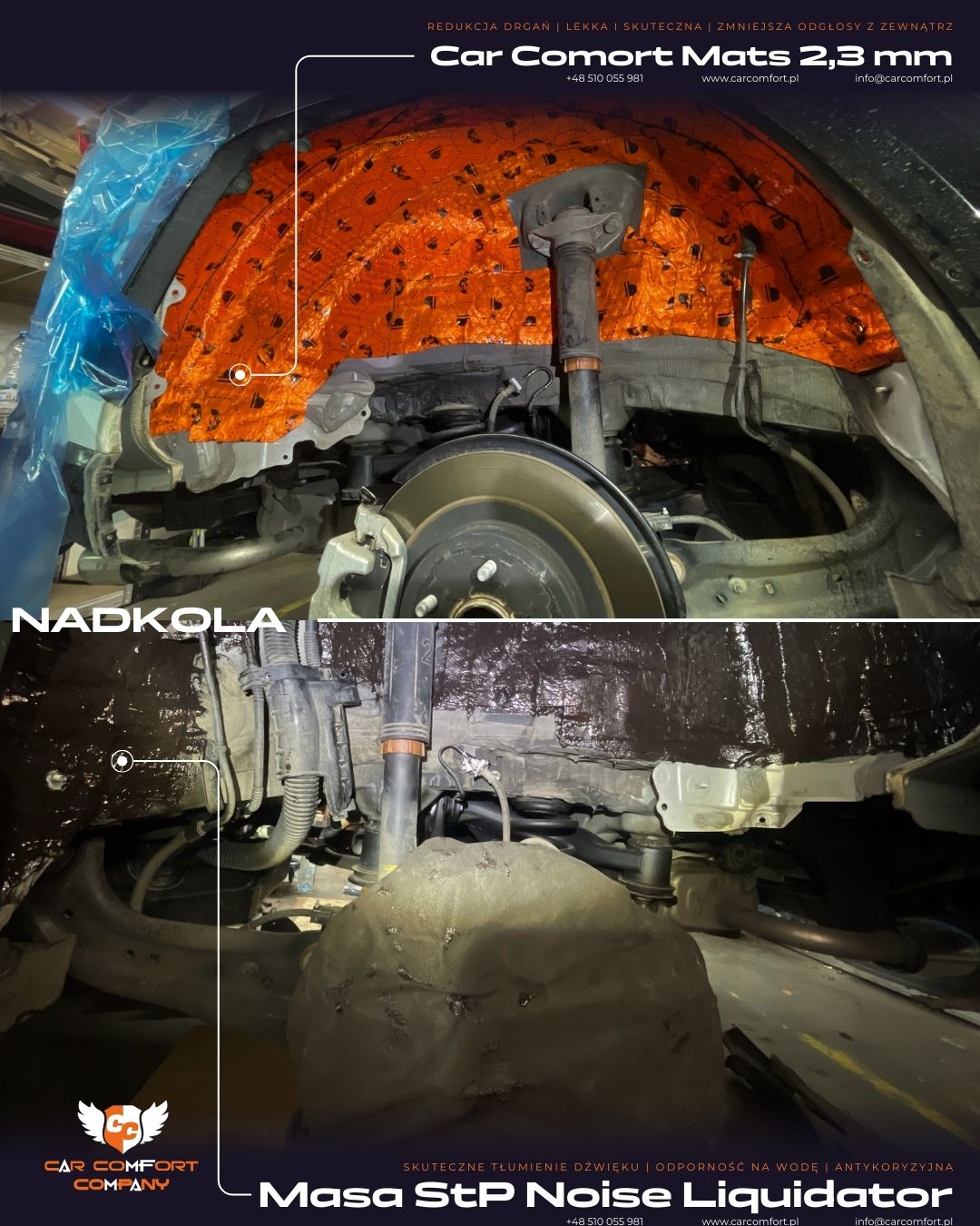 Nadkola Toyoty RAV4 zostały wyciszone w trzech warstwach materiałów akustycznych. Pierwszą warstwę stanowi mata butylowa Car Comfort Mats 2,3mm, która tłumi wibracje blachy nadkola i stanowi solidną bazę dla kolejnych warstw. Następnie aplikowany jest StP Noise Liquidator A+B 1kg – płynna masa akustyczna natryskiwana na całą powierzchnię wnęki, docierająca w miejsca niedostępne dla mat. Trzecią warstwę zamyka pianka K3s 3mm – odporna na wilgoć i temperaturę, idealna do stref narażonych na wodę i błoto wnikające od strony kół.