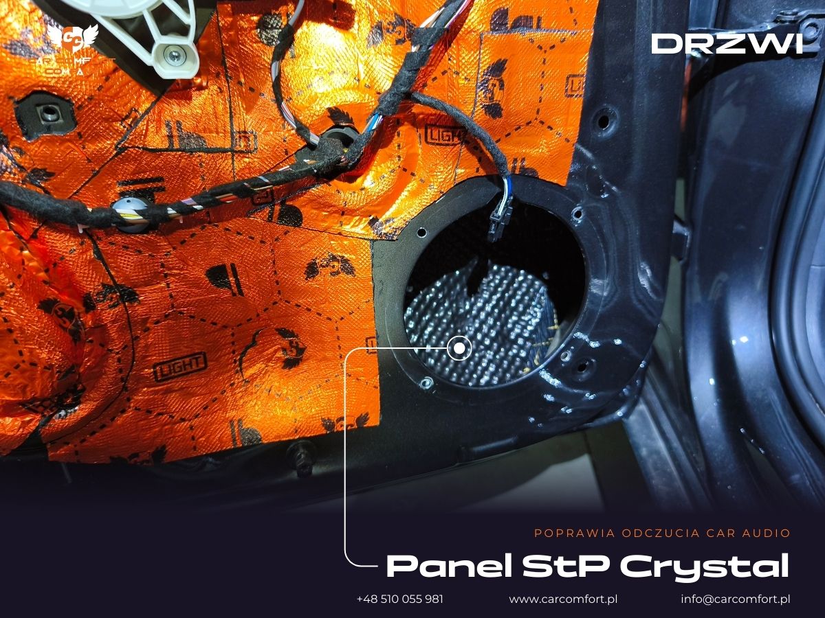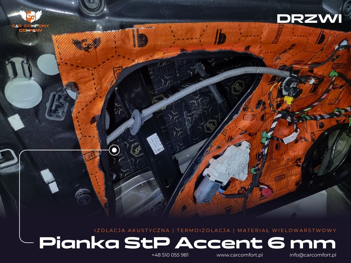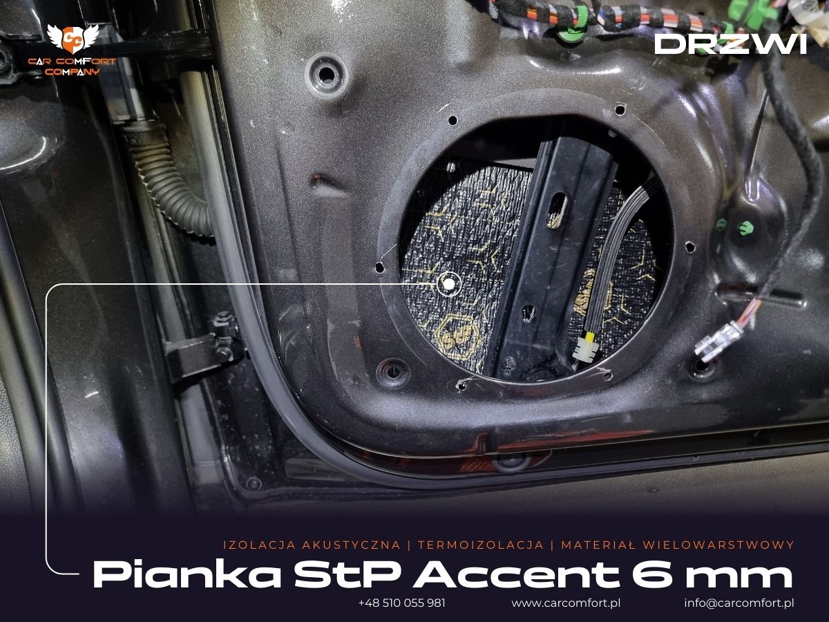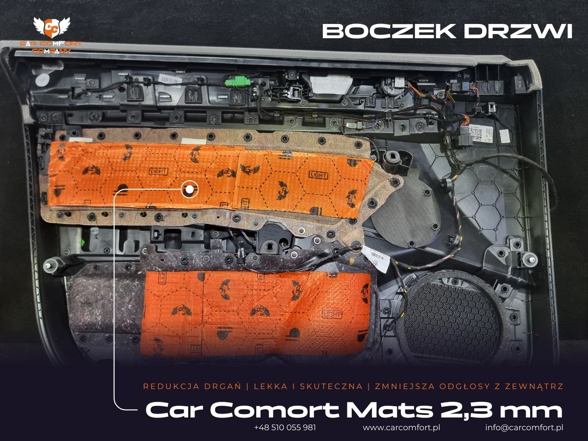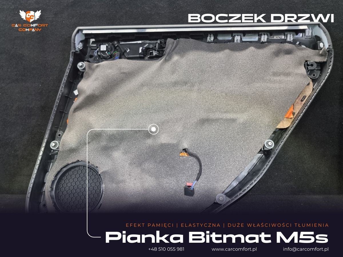 Na boczkach drzwi zastosowano Bitmat M5s, który eliminuje trzaski plastikowych elementów i poprawia szczelność akustyczną drzwi. Efektem prac jest wyraźnie cichsze wnętrze oraz lepsze warunki do słuchania muzyki.