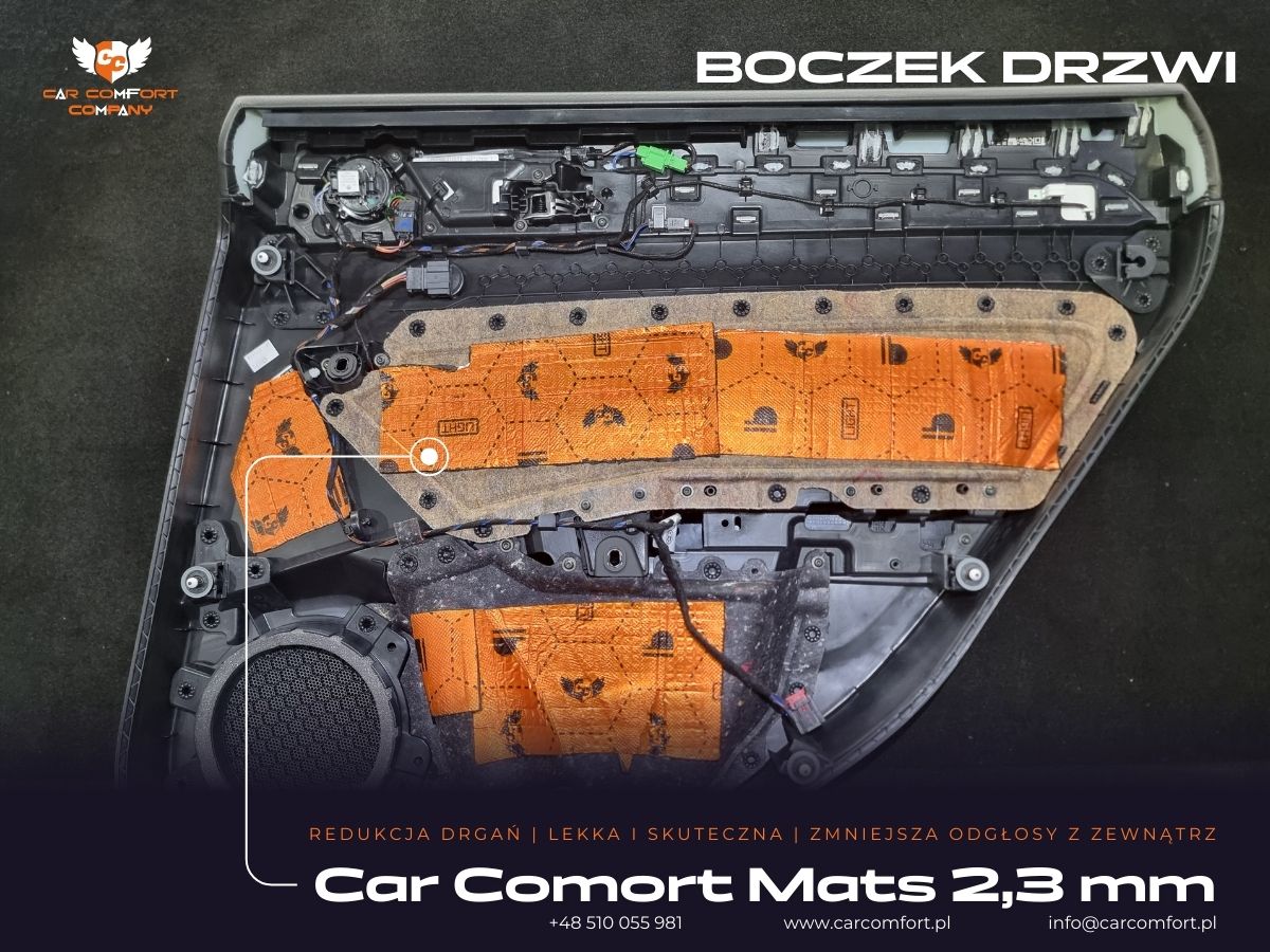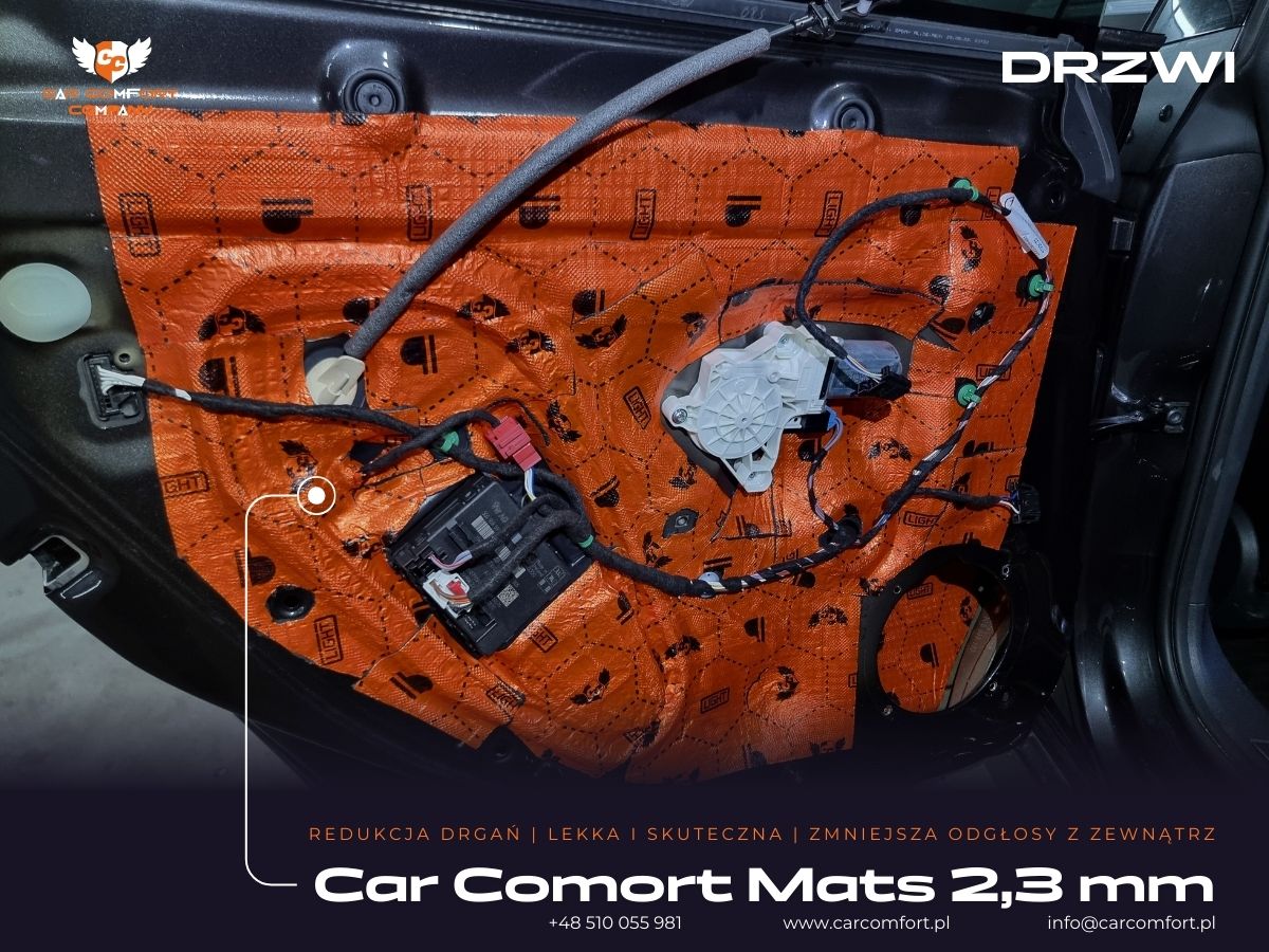 Drzwi Volkswagena Arteon zostały wyciszone przy użyciu maty butylowej Car Comfort Mats 2,3 mm, która skutecznie redukuje drgania blachy i ogranicza przenikanie hałasu do wnętrza pojazdu.