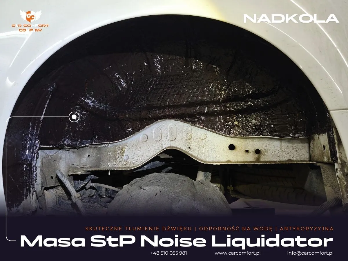 W Volkswagenie California Beach skoncentrowaliśmy się na precyzyjnym wyciszeniu nadkoli, które są często głównym źródłem hałasu z drogi i szumu opon. Na metalową część nadkola jako pierwszą warstwę zaaplikowano matę butylową Car Comfort Mats. Ta wysokiej jakości mata doskonale tłumi wibracje i rezonanse, tworząc solidną barierę akustyczną. Następnie, dla jeszcze lepszego efektu, zastosowano Noise Liquidator – innowacyjny preparat wyciszający, który utwardza powierzchnię i niweluje wszelkie pozostałe drgania, co znacząco zwiększa efektywność wygłuszenia.