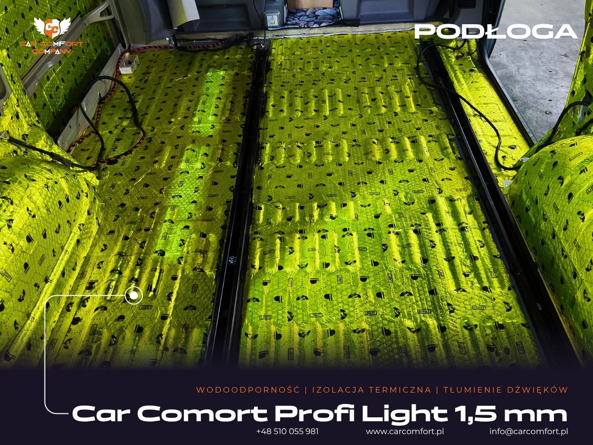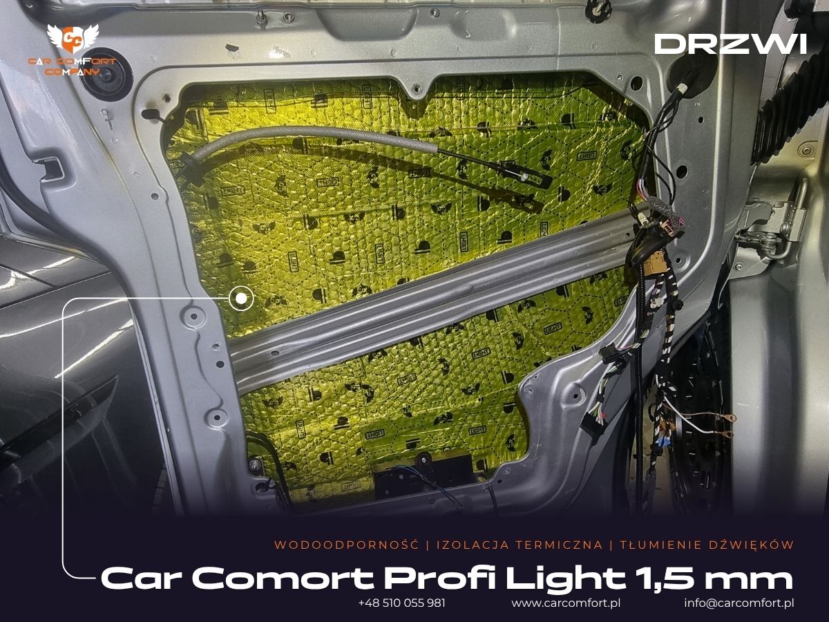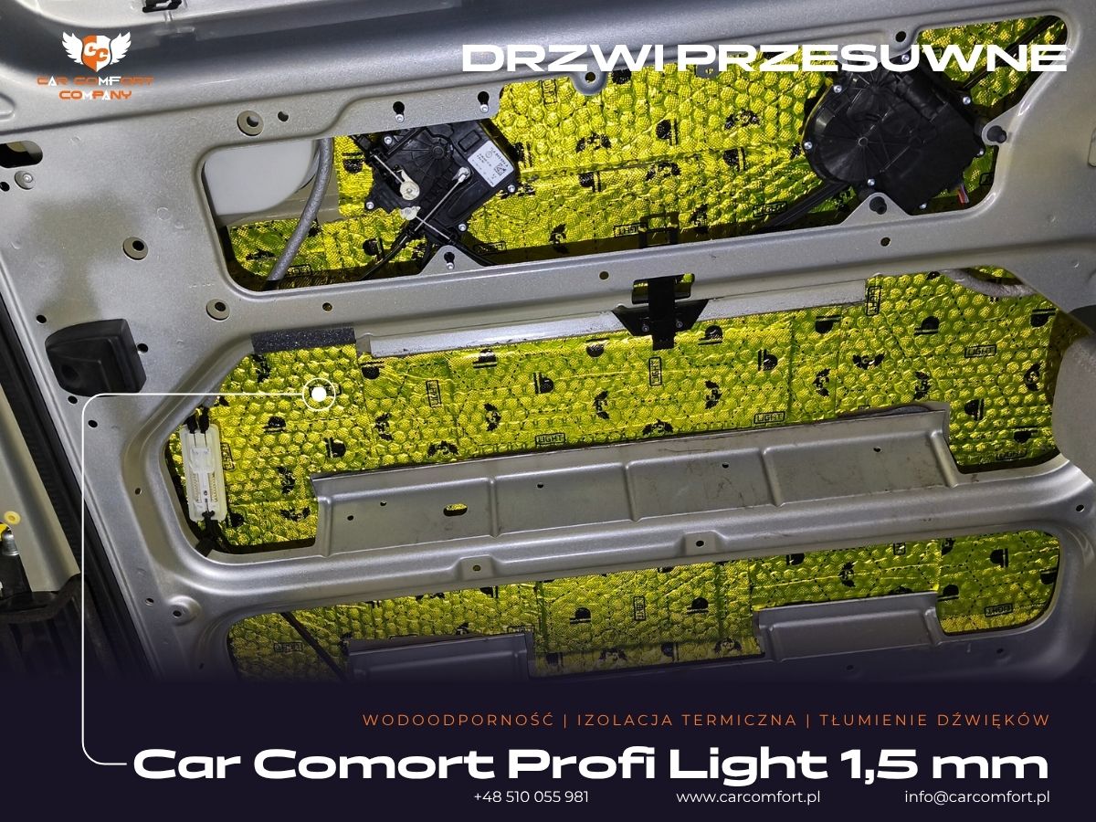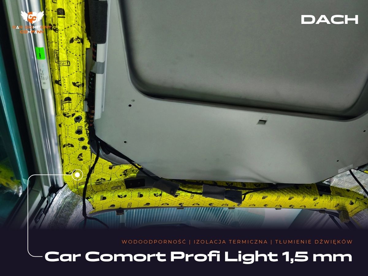 Wykorzystano materiały Car Comfort Profi Light, pianki K3s ALU i K6s ALU oraz Bitmat M5s, co zapewnia skuteczne tłumienie hałasu oraz utrzymanie temperatury wewnątrz pojazdu.