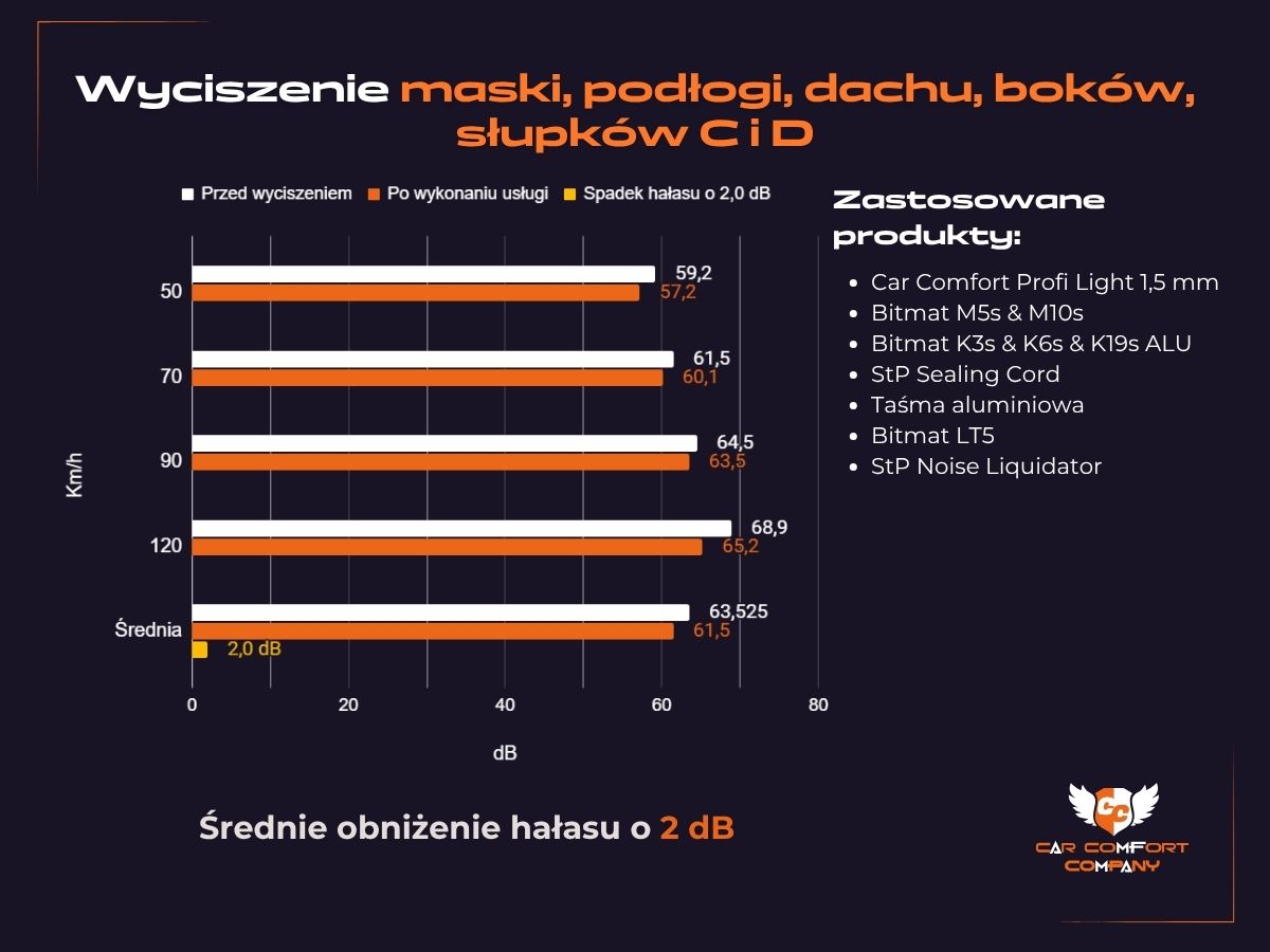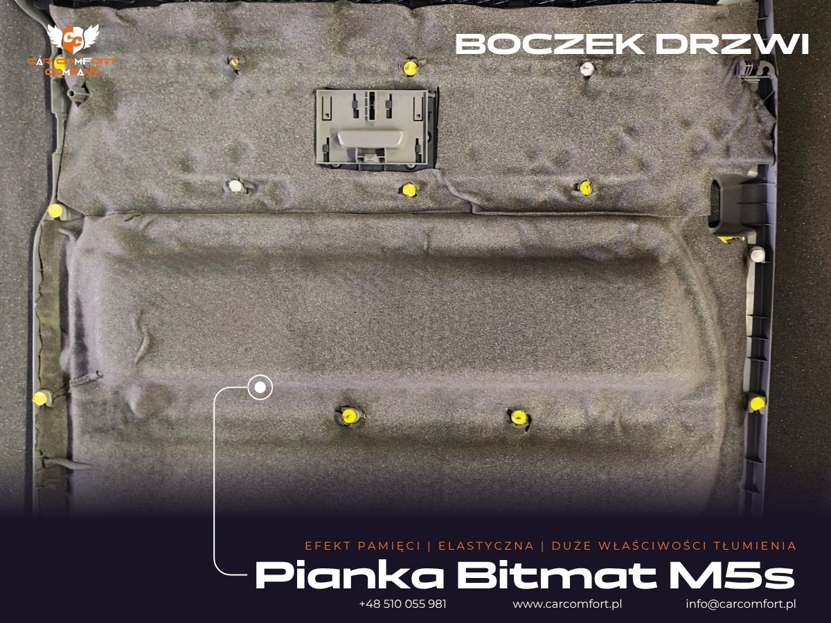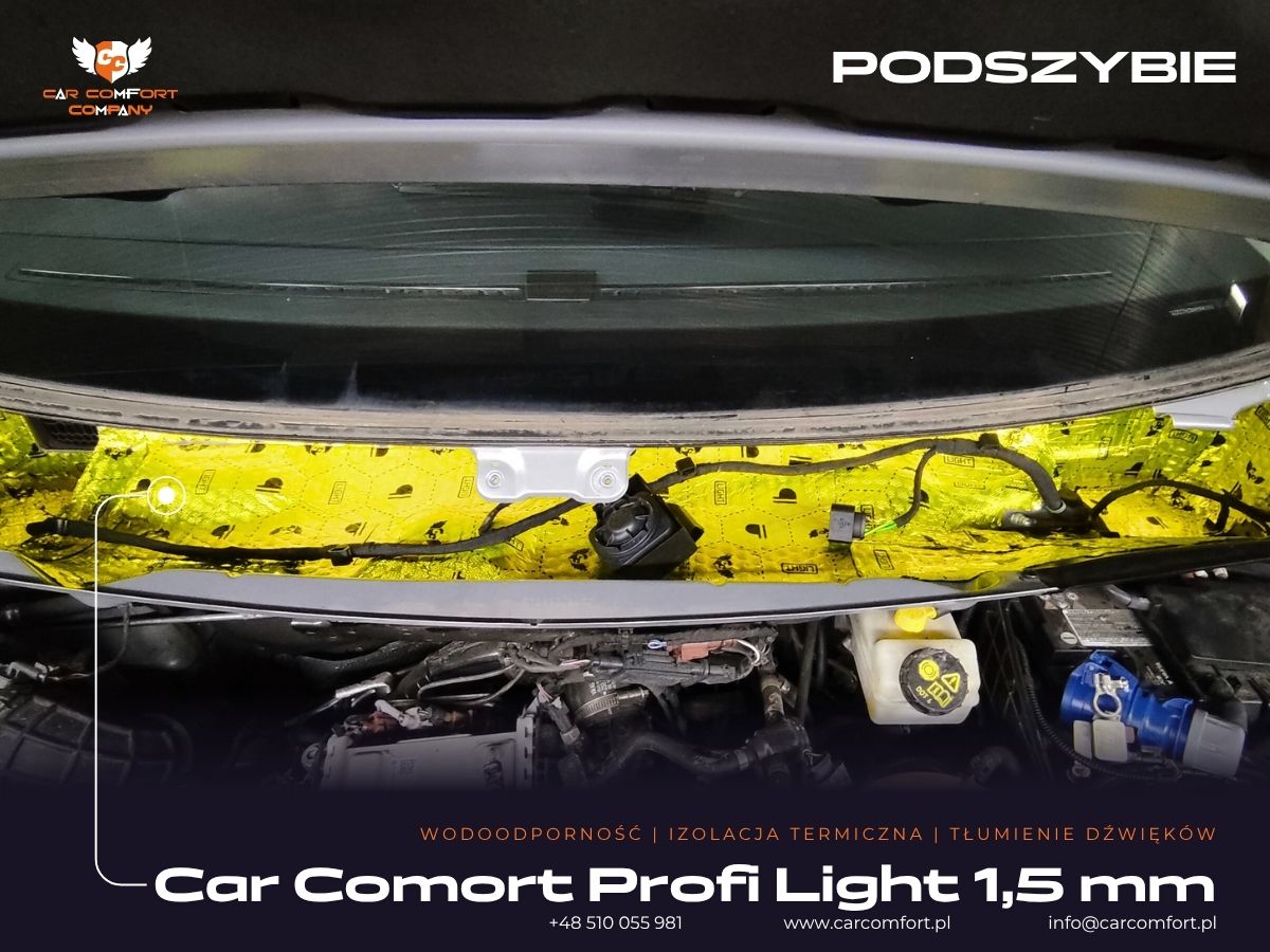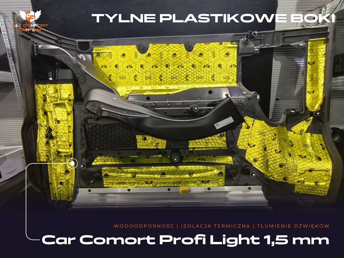 Wykorzystano materiały Car Comfort Profi Light, pianki K3s ALU i K6s ALU oraz Bitmat M5s, co zapewnia skuteczne tłumienie hałasu oraz utrzymanie temperatury wewnątrz pojazdu.