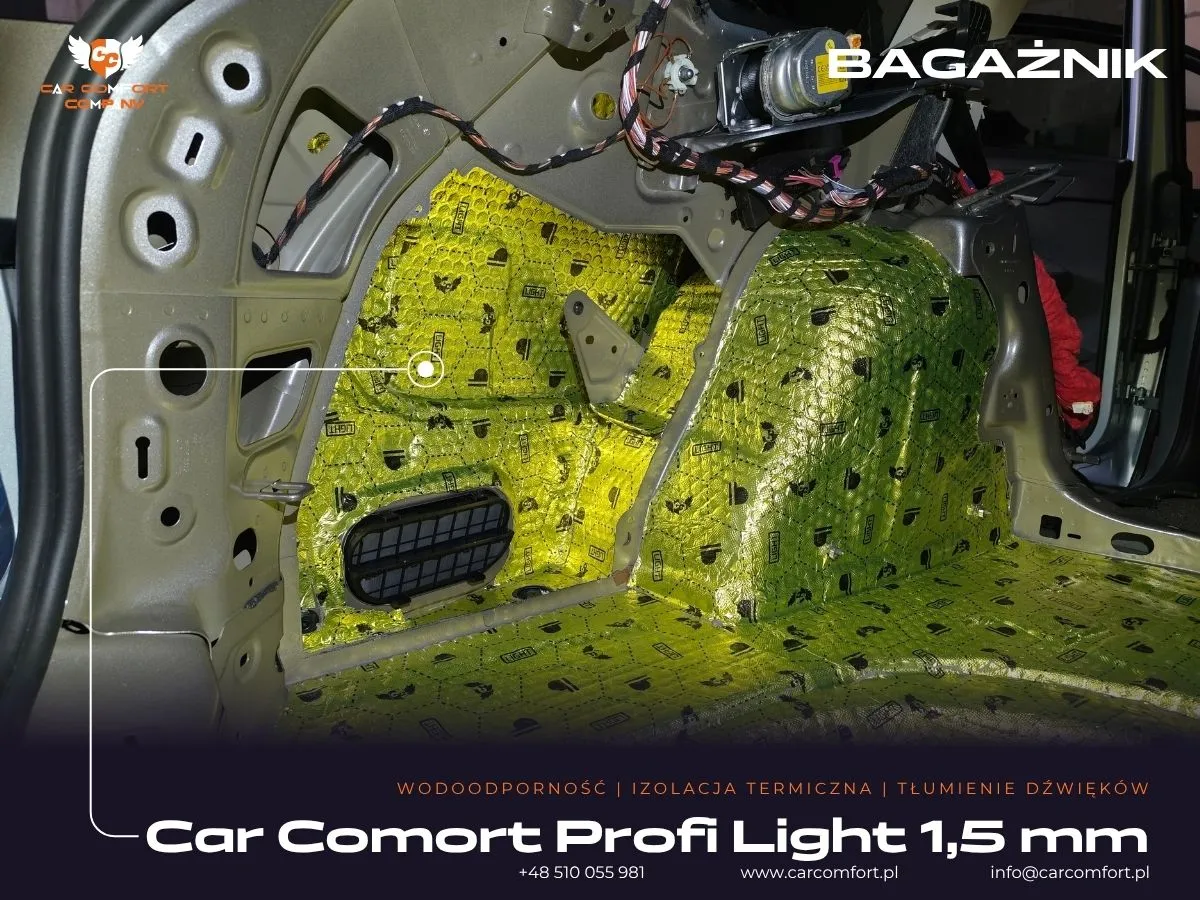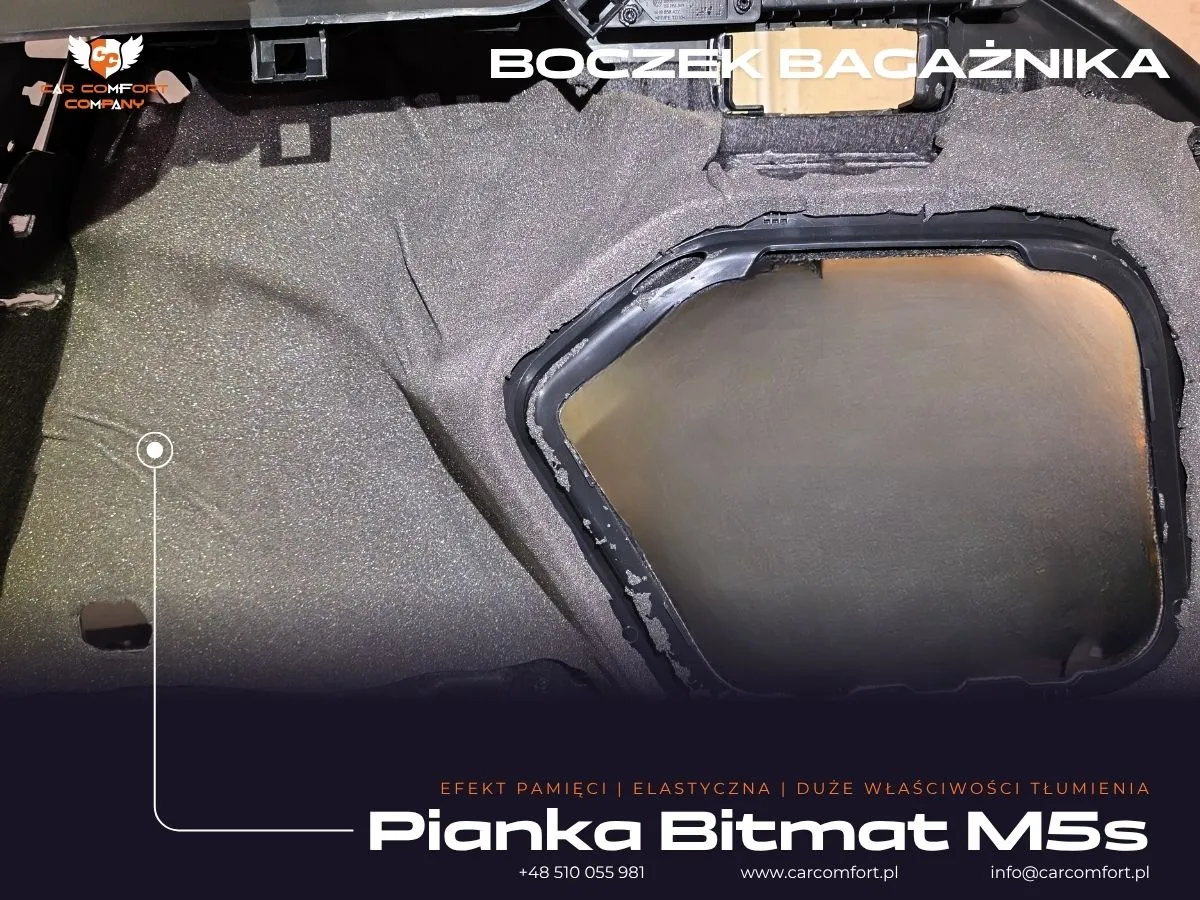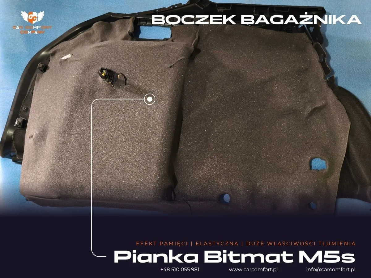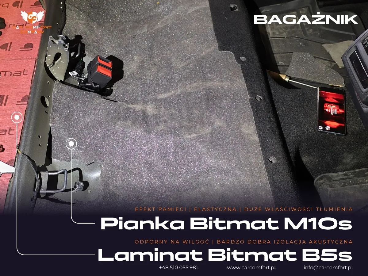 Do wyciszenia nadkoli plastikowych, nadkoli zewnętrznych oraz bagażnika użyliśmy wysokiej jakości materiału StP Profi 1,5 mm jako pierwszej warstwy. Na plastikowe nadkola oraz bagażnik jako drugą warstwę aplikowaliśmy B5s, zapewniając dodatkową izolację. Nadkola zewnętrzne zostały zabezpieczone drugą warstwą Noise Liquidator StP, a bagażnik dodatkowo wzmocniony Bitmat M10s. Boczki bagażnika zostały wyciszone materiałem M5s.
