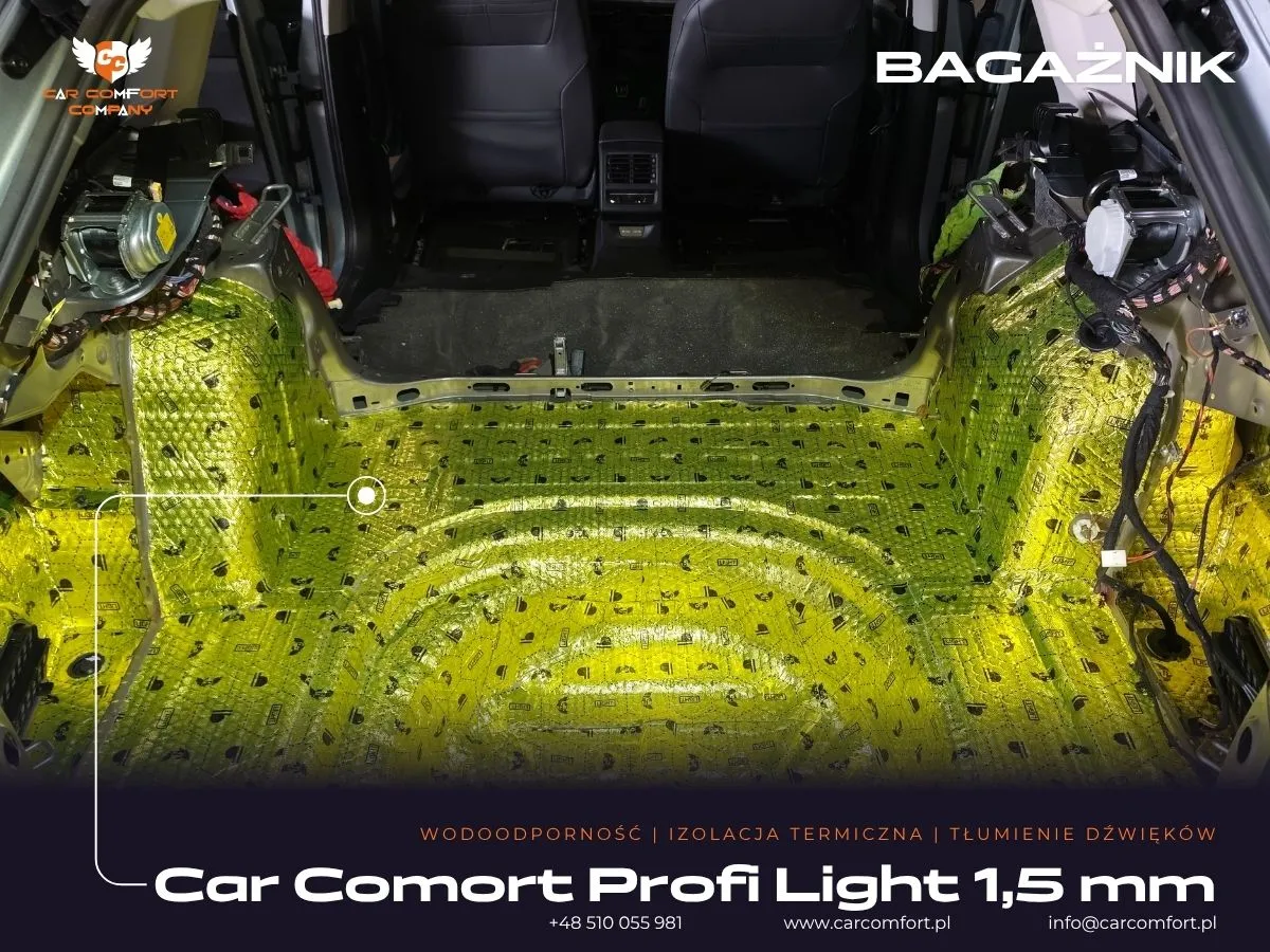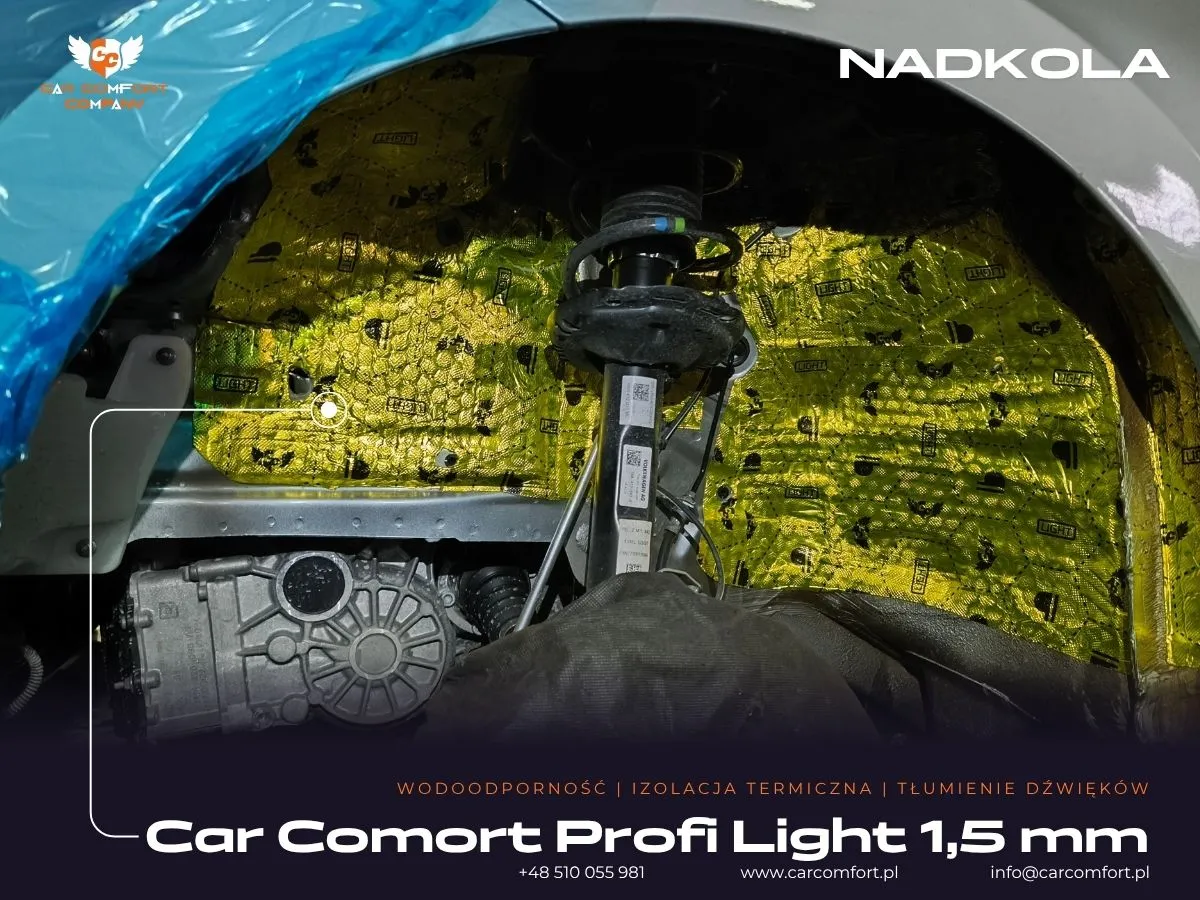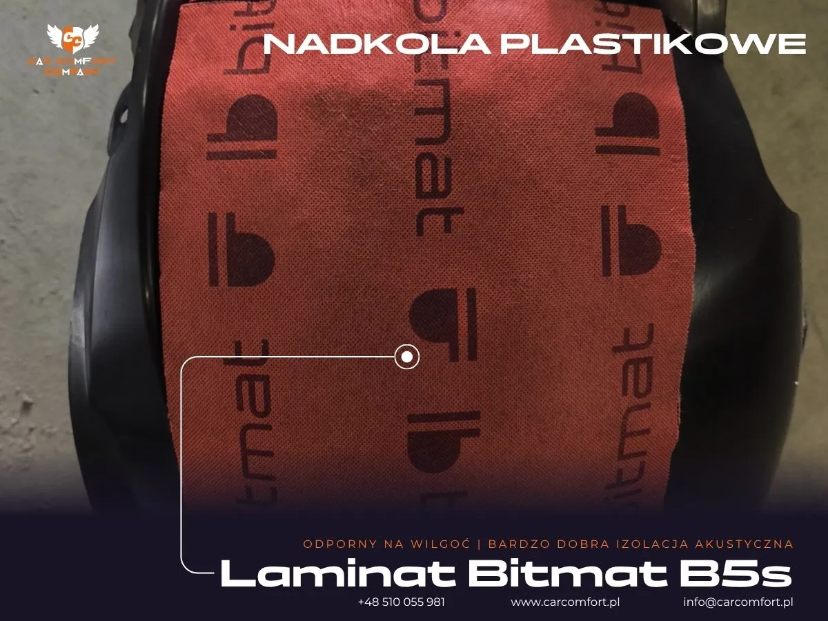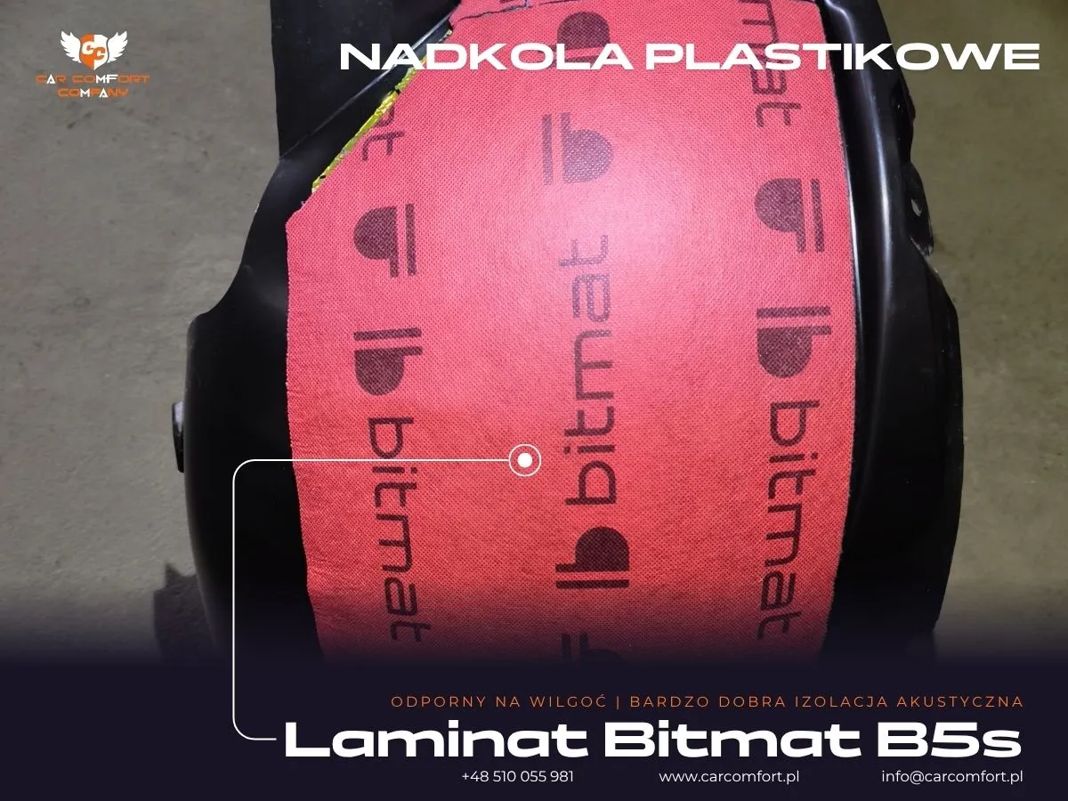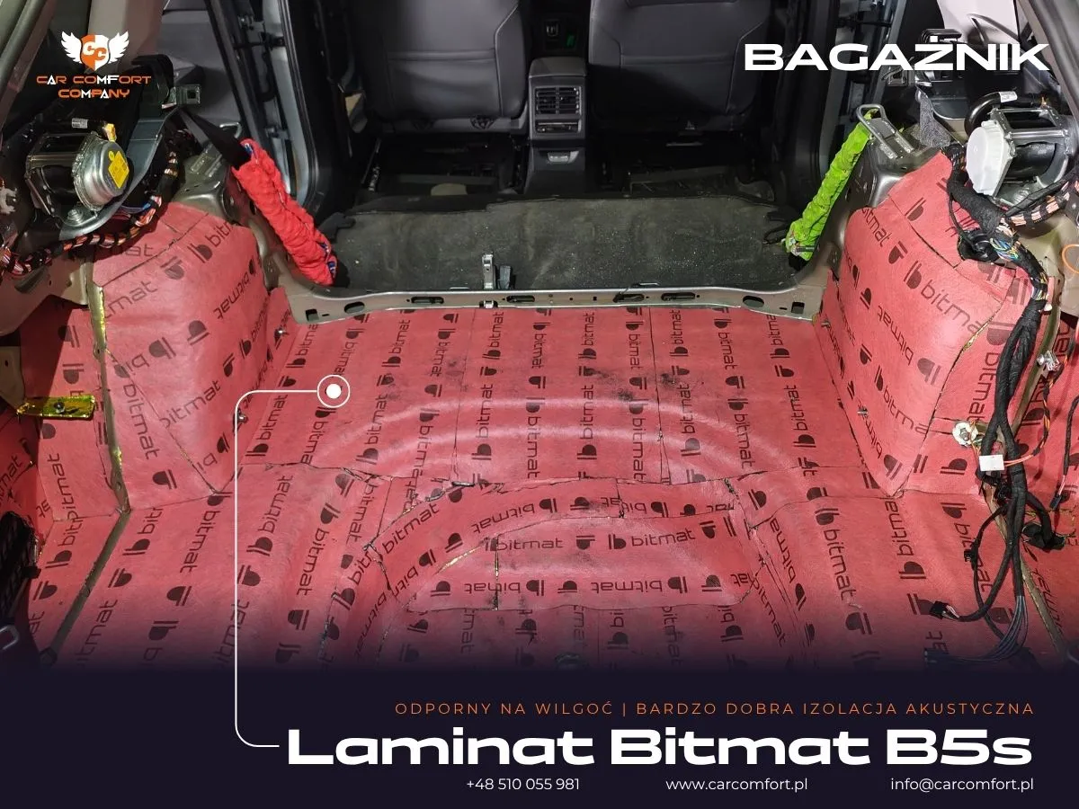 Do wyciszenia nadkoli plastikowych, nadkoli zewnętrznych oraz bagażnika użyliśmy wysokiej jakości materiału StP Profi 1,5 mm jako pierwszej warstwy. Na plastikowe nadkola oraz bagażnik jako drugą warstwę aplikowaliśmy B5s, zapewniając dodatkową izolację. Nadkola zewnętrzne zostały zabezpieczone drugą warstwą Noise Liquidator StP, a bagażnik dodatkowo wzmocniony Bitmat M10s. Boczki bagażnika zostały wyciszone materiałem M5s.