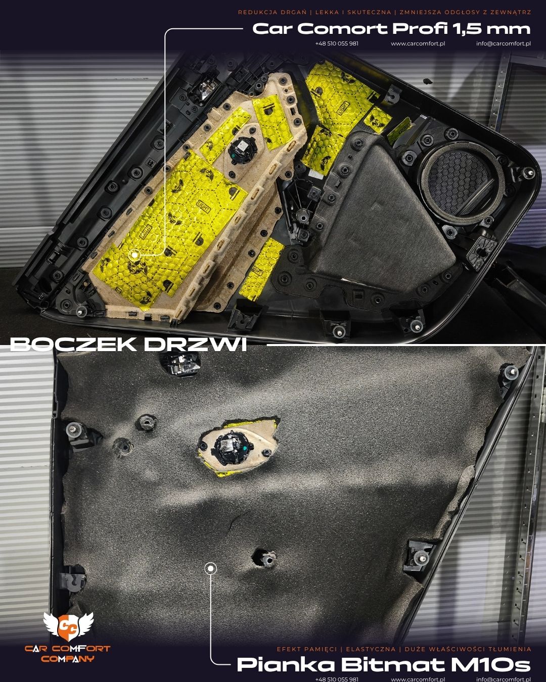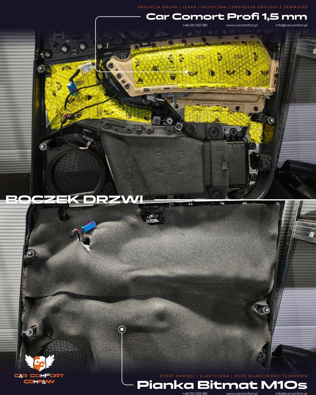 Drzwi zostały wyciszone matą Car Comfort Profi Light 1,5 mm, która skutecznie tłumi drgania i usztywnia konstrukcję.