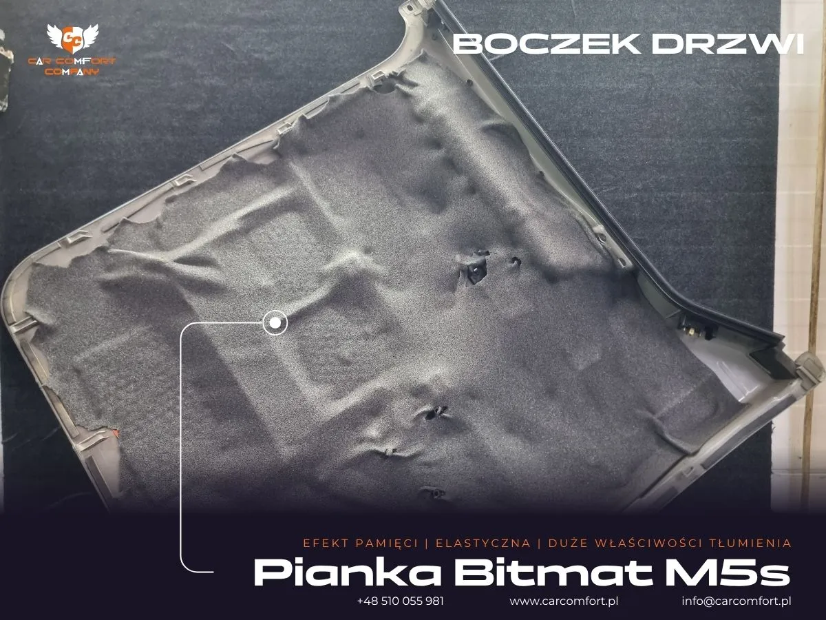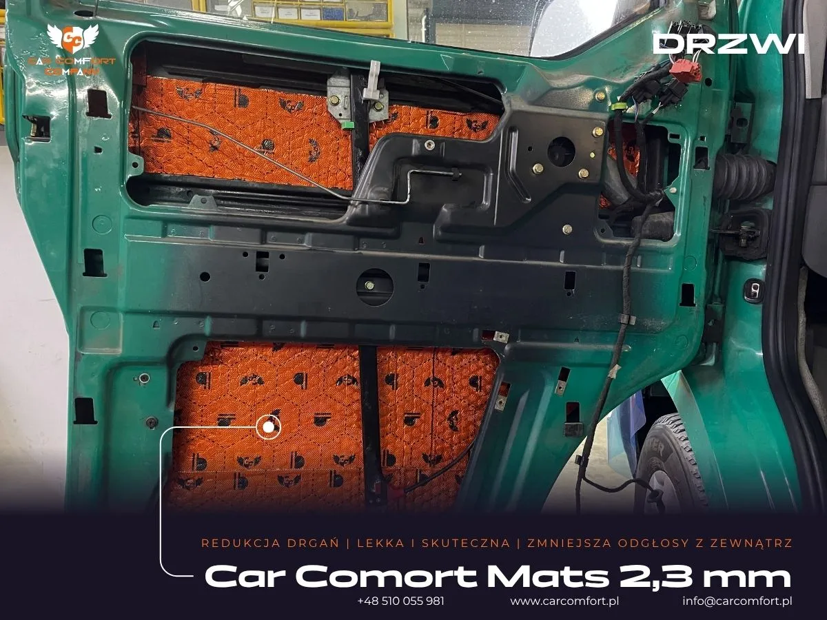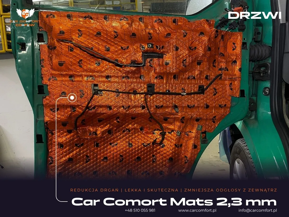 Do wyciszenia drzwi w Transporterze T4 użyto sprawdzonych materiałów. Na wewnętrzną oraz zewnętrzną blachę drzwi (pierwsza i druga warstwa) zaaplikowano maty butylowe Car Comfort Mats. Boczek drzwiowy również otrzymał pierwszą warstwę z mat Car Comfort Mats, a jako drugą warstwę tłumiącą i izolującą zastosowano piankę Bitmat M5s.